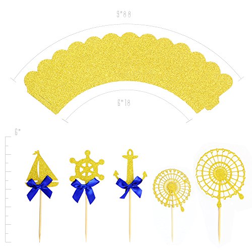 - Included in total 12pcs toppers and 12pcs gold wrappers . 3 types topper shapes are sailboat theme topper x3 , Large ferris wheels x4, and medium ferris wheels x5