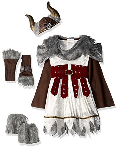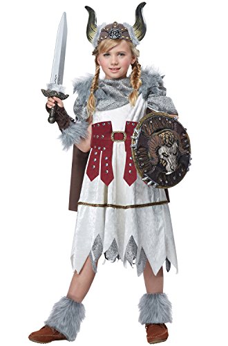 The Vikings sail strong and proud along the roughest seas. The valorous Viking girl is a deluxe costume that include a dress, cape with faux fur, belt with studded Guard piece, fingerless gloves with faux fur trim, boot covers with faux fur, and half helmet front piece. A chain mail looking fabric makes up the top of the cape and is used as a trim at the bottom of the skirt. Shoes not included. Barbarian combat shield & sword set sold separately.Feature