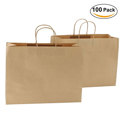 Road 16x6x12 Inches 100 Pcs Large Kraft Brown Paper Bags with Handles, Shopping, Grocery, Mechandise, Party Bags