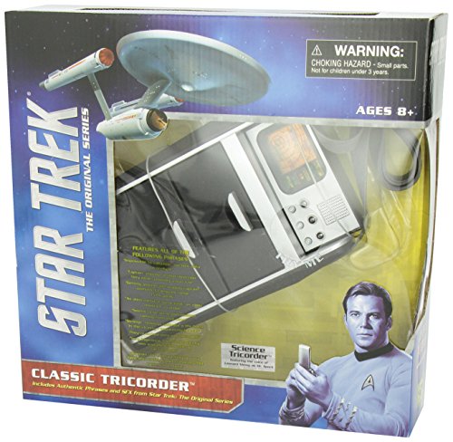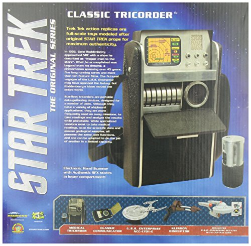After the runaway success of Star Trek's classic-era Phaser and Communicator, boldly go where no man has gone before with this authentic Tricorder roleplay replica! Based on the classic 23rd century design, the electronic Tricorder features silver highlights over a black finish, as well as light and sound effects taken from the classic Star Trek series. Also included is the removable scanner accessory perfect for your next Away Mission! Requires?four?"AA" batteries, included. Measures?8"L?x 4"Wx 2"H.Feature