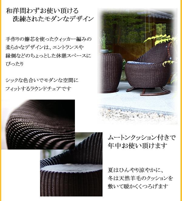 360度回転機能付きのコンパクトチェア。縁側やエントランスなどちょっと掛けたい場所に最適な、手作りの籐芯を使ったウィッカー編みの柔らかなデザインに仕上がっています。座面には、天然羊毛の巻き毛タイプのクッション付で、年中お使い頂けます。 |