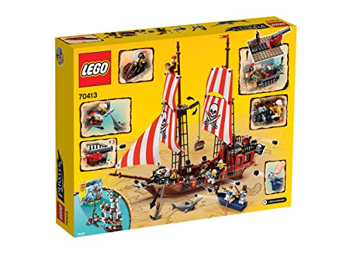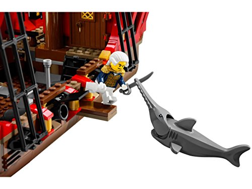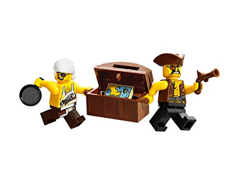 海賊船の帆を上げて、航海に出発! 海賊が巨大ガレオン船に乗って広い海に繰り出そうとしている。奪ったたくさんの宝物がつまった箱もたずさえているぞ。 海兵隊はボートで海賊に追い付き、戦いをはじめようとしている! 海兵隊が海賊船にのりこみ、盗まれた宝を奪い返すのを助けよう。 一斉攻撃をしかけて、船に乗りこんだら、武器をかまえて、海賊を打ち負かそう。 戦いに勝利したら、海賊をろうやにぶちこんで、閉じ込めてしまおう! このセットには、帆やロープ、ワイヤー、見張り台が付いている2本の高いマスト、イカリの付いた動くウインチ、大砲、 歩くことができる船から突き出した板が装備された海賊船、海兵隊の手漕ぎボート、のこぎりザメが入っているよ。 ●がいこつと赤ヒゲ船長、海賊、キャビンボーイ、料理人、海兵隊の司令官、海兵隊の軍曹、海兵隊のミニフィギュア付き。Feature