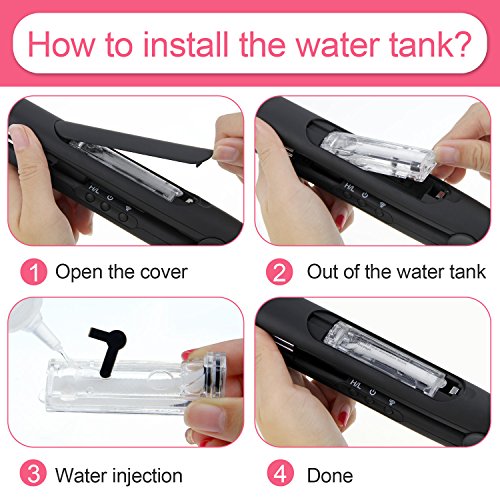 Notes: 1.Fill up the water tank with water injection bottle and make sure it will not leak away. 2.Please do not wet the power contact of the tank point when you're filling water into it. 3.The Full tank can be used 5-8 mins continuously and please don't enable this function without water. 4.Please kindly note the steam is not so heavy and not obvious to see by naked eyes. 5.The ceramic plates are HOT! Avoid direct skin contact.?