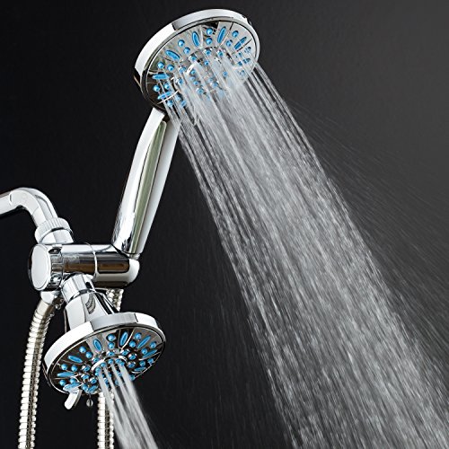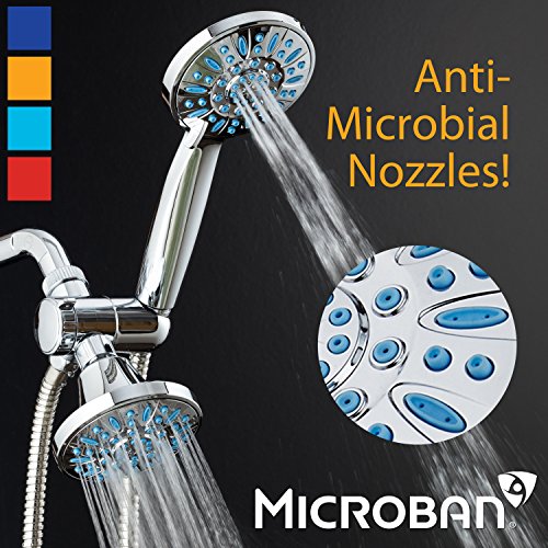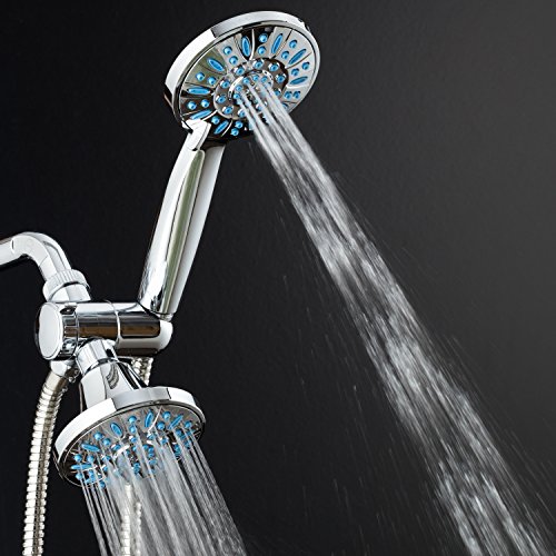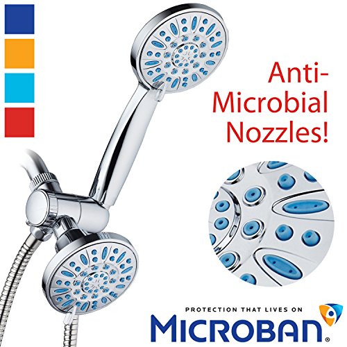 LATEST DESIGN FROM TOP-BRAND MANUFACTURER. Discover the ultimate combination of Top Quality, High Power & Microban® Protection! Patented 3-way Water Diverter lets you enjoy two luxury showers separately or together! Each features advanced 3-zone Dial, Rub-clean Jets and 6 settings: Rain, Massage, Mist, Rain/Massage, Rain/Mist and Water-saving ON/OFF Pause. Includes Angle-adjustable Bracket, Stainless Steel Hose, Plumber's Tape & LIFETIME WARRANTY. All-Chrome Finish. EASY TOOL-FREE INSTALLATION