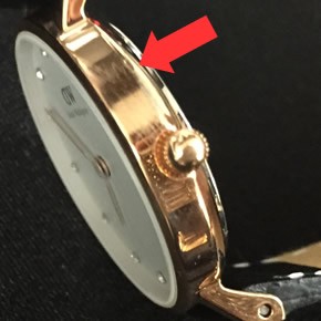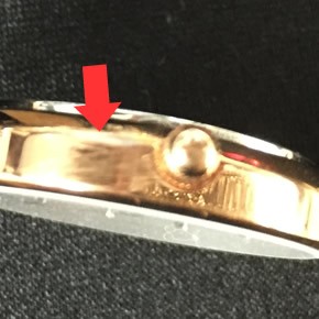 ステンレスケースの右側、リューズの上部分に線のような引っ掻いた傷が斜めに数本入っています。 |