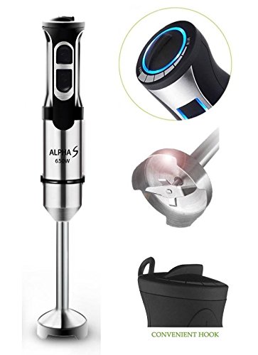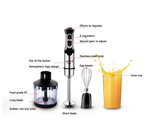 4-IN-1 VALUE AND MULTI-FUNCTIONS • Alpha S Hand Blender comes with 1 blending stick, 1 processor/chopper bowl, 1 whisk, 600ml vessel. • Multi-quick hand blender can be used as food processor/chopper, hand mixer, mincer, and egg beater. 8-SPEED VARIABLE CONTROL AND POWERFUL MOTOR • Powerful 650-watt motor! Immersion mixer with a blending blade attachment and whisk attachment is versatile enough to replace larger blenders and mixers in your kitchen. • Speed "1" - "8" and press the Gear 1 (for soft goods) or Gear 2 (for medium hardness) to operate hand mixer. ERGONOMIC HANDLE • Push-button control for continuous or pulse action; comfort grip handle and ergonomically designed stainless steel body which allows easy control over the blender. • An easy-grip design promotes secure, non-slip speed control and the ability to quickly and easily remove attachments when necessary. BLEND, CHOP, GRIND, WHIP • Alpha S Hand Blender is designed to handle a variety of basic tasks, such as blending, mixing, chopping, grinding, whipping, pureeing to give you time for more creative culinary undertakings. • It's quite handy Size, easy to hold on and easy to clean.Feature