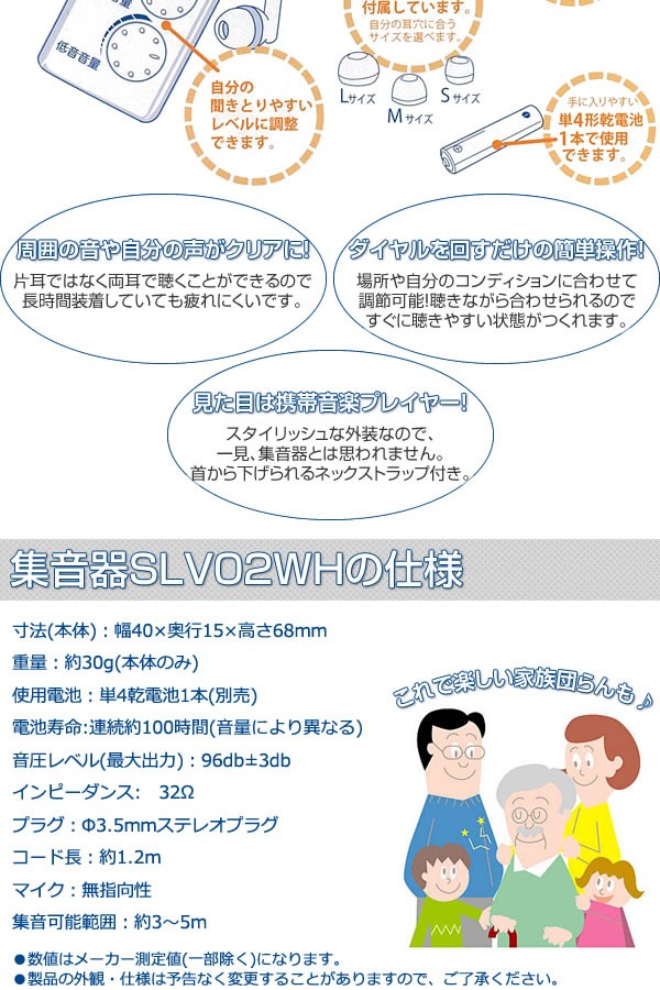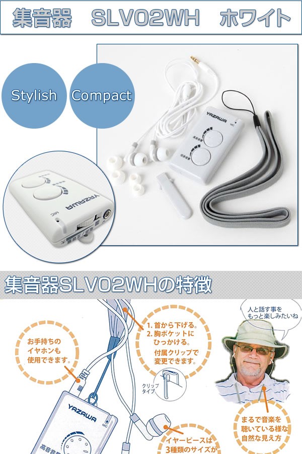 小さな声が大きく聴こえるおしゃれな集音器です。今まで聞き逃していた音をクリアに聴くことができます。補聴器をつけることに抵抗がある方に! サイズ/本体:W40×H68×D15mm 重量/約30g(本体のみ) 仕様/保証期間:1年 付属品/イヤーチップ(S・M・L)、両耳タイプイヤホン(約1.2m)、クリップ、ネックストラップ、取扱説明書 製造国/中国 ※本商品は補聴器ではありません ※サプライヤー直送品