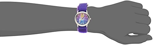 This child's time teacher watch features Disney's character Cinderella on the watch's face, surrounded by a silver toned bezel, which measures 30mm in diameter. The hour and minute hands are labeled and the second markers, accented by Swarovski elements, are set in a ring around the hours. The watch also has a purple nylon strap with a Velcro® closure. The whole watch is 7.25in in length, but can be adjusted smaller. Any metal on the watch is hypoallergenic surgical steel and free of lead, mercury, cadmium, and nickel. One-year limited manufacturer's warranty.Feature