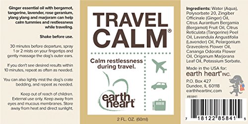Ease your dog's stomach upset and calm restlessness, drooling, panting, or whimpering that some dogs experience during travel of all kinds! Travel Calm combines calming essential oils with pure essential oil of ginger, a proven natural remedy for stomach upset. Spray directly onto your dog’s crate bedding or clothing, inside the car, or lightly mist your fingertips and massage onto the dog’s outer ears or abdomen. This family friendly product is safely diluted for use with puppies from 8 weeks old and a must-have for all your travel adventures. Pure essential oils of bergamot, tangerine, lavender, geranium, ginger, marjoram, and ylang ylang, in water with polysorbate 20 (emulsifier) and potassium sorbate (preservative).Feature