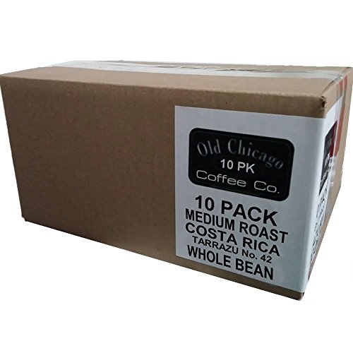 -. Binding : Grocery -. Brand : Old Chicago Coffee -. Feature : Roasted with AAA beans from the Tarrazu coffee region of Costa Rica / 100% Single Origin - Grown at high elevations of 4,500 feet / Sweet Aroma comes from the San Marcos region of Costa Rica's Tarrazu growing region / Rich reserve of chocolate and tangerines with complex sweetness and sharp acidity / Buttery flavored body that offers a soft, gentle aftertaste. Medium / Dark beans feature mild oil, naturally developing durnig roasting. -. Label : Old Chicago Coffee Co. -. Manufacturer : Old Chicago Coffee Co. -. NumberOfItems : 10 -. PackageQuantity : 10 -. ProductGroup : Grocery -. ProductTypeName : GROCERY -. Publisher : Old Chicago Coffee Co. -. Size : 8 oz. x 10 Bags -. Studio : Old Chicago Coffee Co. -. Title : Bulk Lot Case - Whole Bean Costa Rican Tarrazu Roasted Coffee Beans - Old Chicago Coffee