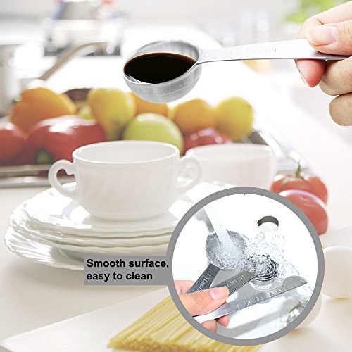 Overall solution for simple cooking: Set of 7 including 6 measuring spoons and 1 measuring stick spoons,the measuring spoons includes 1-Tablespoon (15ML), 1/2-Tbsp (7.5ML), 1-tsp (5ML), 1/2-tsp (2.5ML), 1/4-tsp (1.25ML), 1/8-tsp (0.63ML) and 1 measuring stick. You can easily measure dry and liquid ingredients such as spice, sugar, salt, oil, coffee, wheat, milk, cheese and many others.