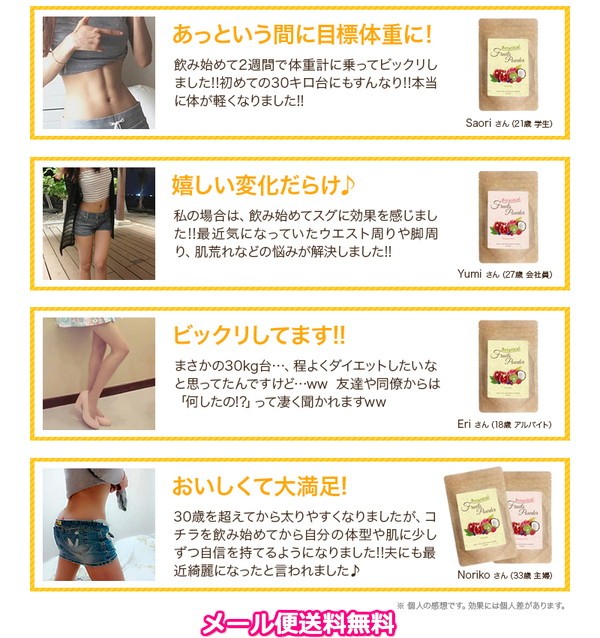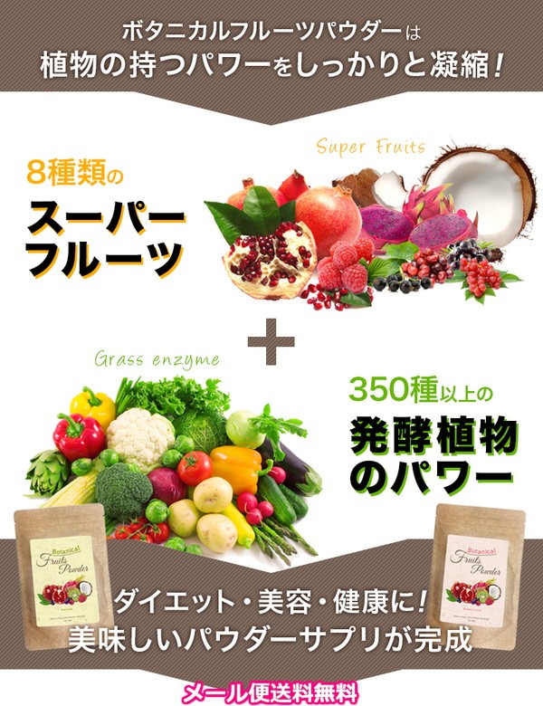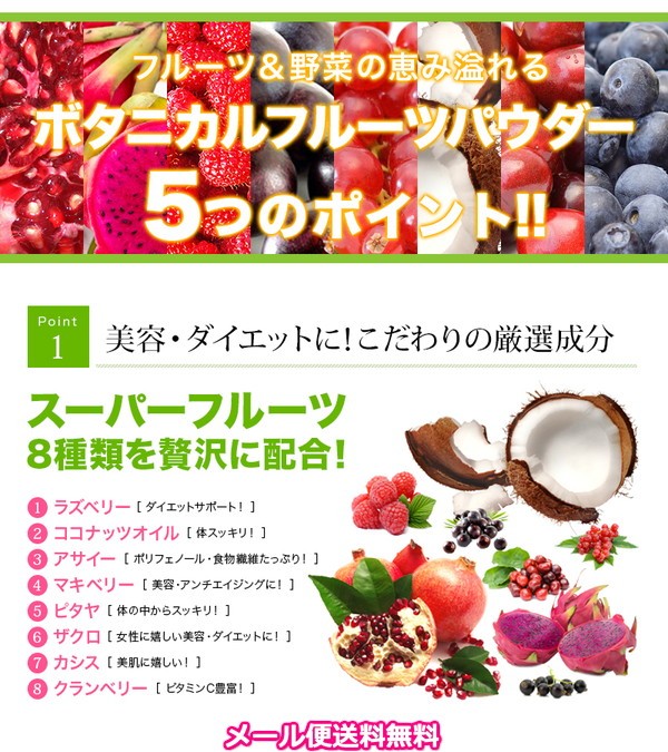 水溶性食物繊維、クランベリーパウダー、ラズベリーパウダー、ココナッツオイル、アサイーエキスパウダー、マキベリー果汁末、ピタヤエキスパウダー、ザクロエキスパウダー、カシスエキスパウダー、植物発酵エキス、野草発酵エキス、植物発酵末、トレハロース、香料、クエン酸、着色料(紅花、クチナシ)、甘味料(アスパルテーム・L-フェニルアラニン化合物)、(原材料の一部に大豆、やまいも、りんご、オレンジ、キウイフルーツ、バナナ、カシューナッツ、ゴマを含む) |