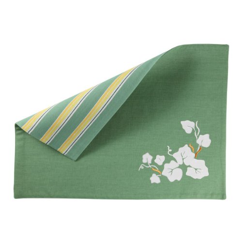 -. Feature : 100 Percent Cotton Twill fabric / Measure 14 by 20 / Made in India of a fine cotton material / Applique Embroidered detailing on one side of place mat and green and yellow striped on the reverse