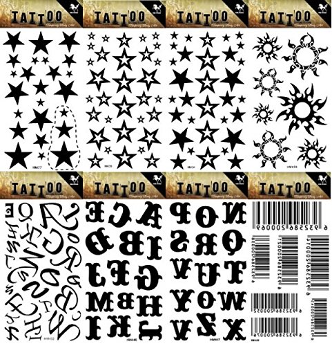 Wonbeauty 8pcs different Fake and real temp tattoo stickers in a package, it including 26 English letters and barcode,stars,suns,tattoo stickers