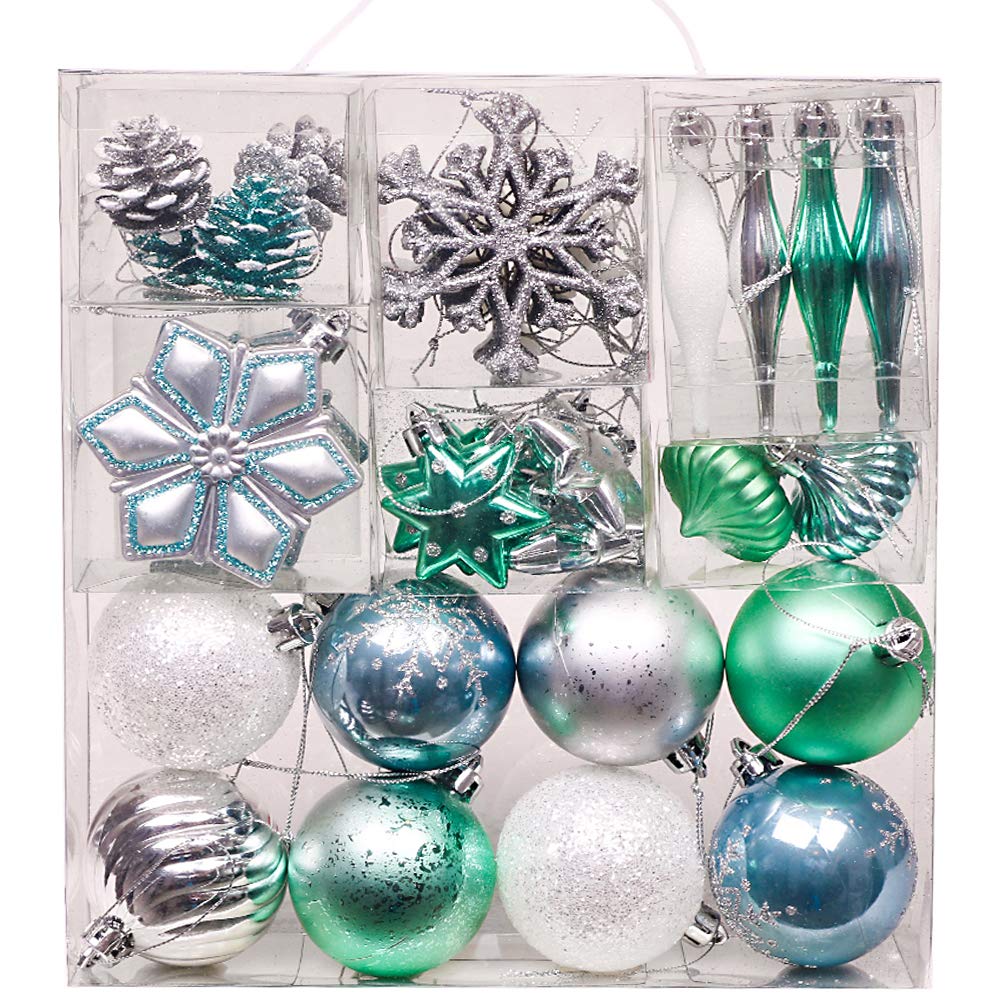 北欧風のオーナメントセットでお手持ちのツリーがキュートと華麗に大変身♪。 ボールは華麗なスカイブルー、銀色、ペパーミント緑を組み合せた上に、シャイニー・マット・クリンクル・フロスト・斑タイプもそれぞれ違うので、クリスマスツリーをとてもお洒落に飾ることができます 目新しい設計:緑&蓝&銀を融合とした優雅色のボールオーナメントは、クリスマスツリーやお部屋を飾るオブジェにピッタリ! ツリーに吊るために糸がついております。とても便利につるすことができる、子供でも使えます。包装も頑丈なデザインを工夫しましたので、ご安心ください。過程~楽しい:飾り付けはアレンジ次第でバリエーションは無限大!セット内容が豊富なので、準備は少し大変かも知れませんが、主役の方の喜ぶ顔を想いながら、準備する過程も楽しんで頂けたら嬉しいです クリスマスツリーを飾りつけるだけではなく、オリジナルのボール型のビーズガーランド、テーブルセッティングを引き立てる小物としても素敵です