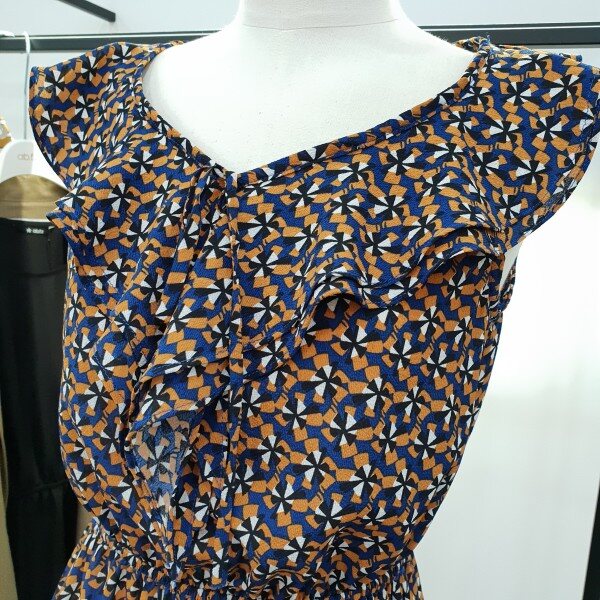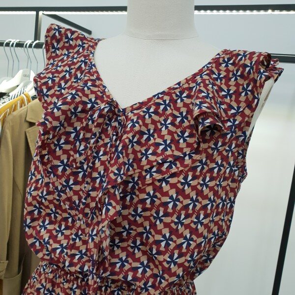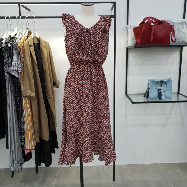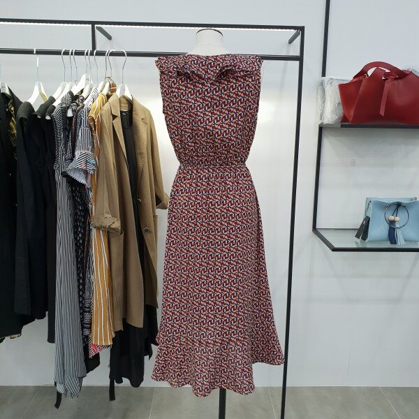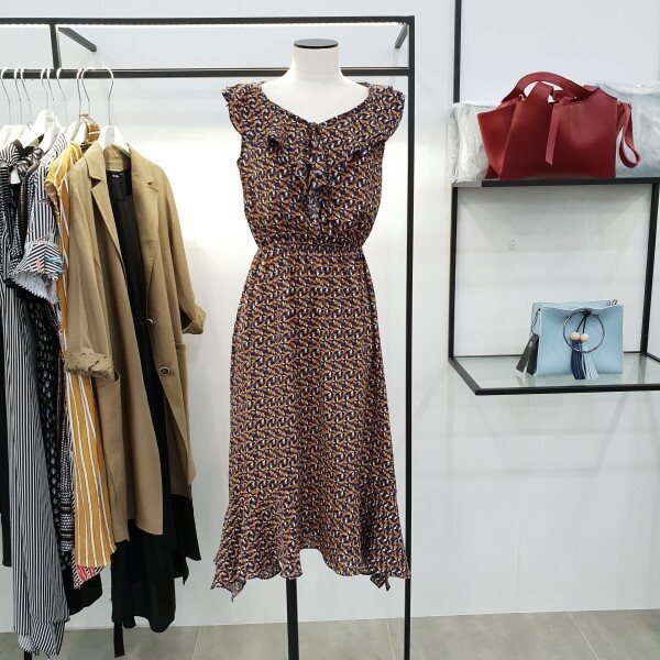 가슴 중앙 프릴이풍성하게 들어가 밋밋하지않아보이는 민소매쉬폰원피스