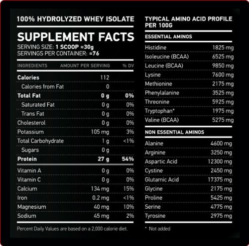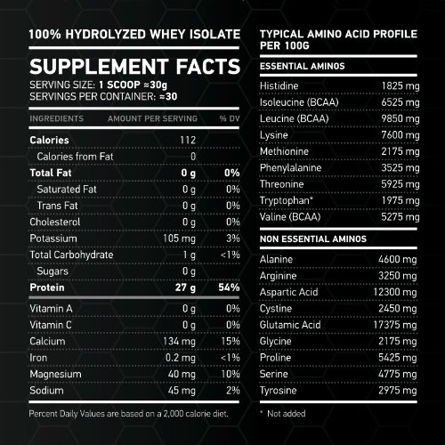 -. Feature : 100% High Grade HYDROLYZED Whey Protein Isolate - 0 Fat / 0 Sugar / 0 Lactose / 0 Cholesterol - Builds Lean Muscle & Helps Inhibit Catabolism - Promotes Fat Loss & Athletic Performance / Aids Fast Recovery & Repair of Muscle Tissue - NO Aspartame / NO Fillers / NO Artificial Colors / 100% Instantized & Fast Absorbing Formula - Mouth-Watering Taste with Truly Astounding Flavor / High in essential amino acids and rich in glutamine peptides / 1 scoop provides 27 grams of ultra high-quality HYDROLYZED WHEY PROTEIN ISOLATES
