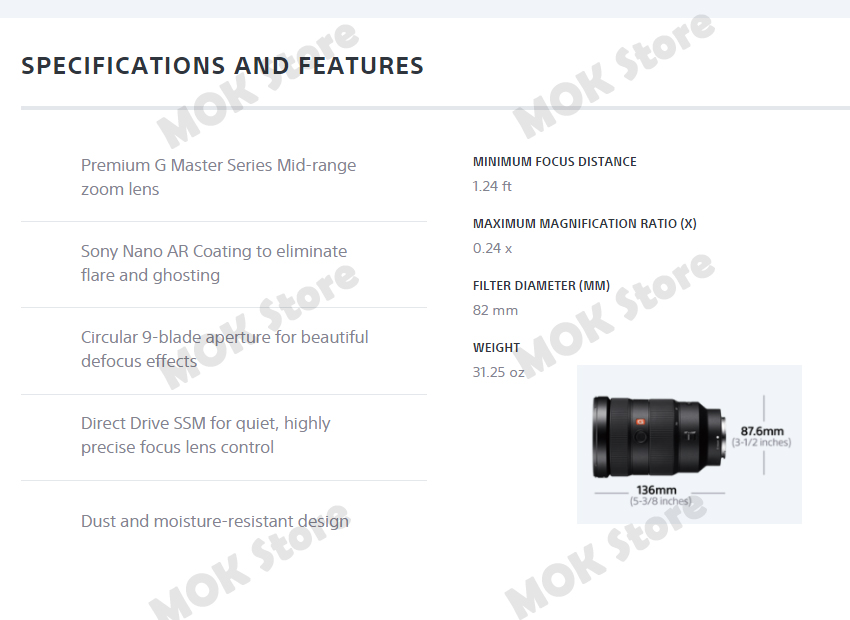 - Aperture : Maximum - f/2.8 / Minimum - f/22