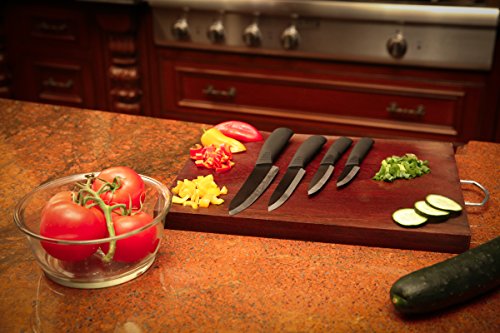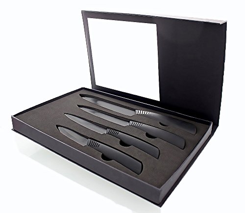 The knife that lasts forever! Composed of sturdy Zirconium Juvo knives are made to stay sharp forever. You'll never have to sharpen another knife, or have to worry about maintenance. Our ceramic blades are corrosion and rust proof. They are easy to clean and dishwasher safe. The handle is made of a high sturdy quality and is ribbed and refined with an ergonomic design for a comfortable grip. Blades are beautiful as they are in a lustrous pearl black that would look great in any kitchen. The best part is that you get four blades for multiple uses: 3' Paring Knife 4' Fruit Knife 5' Chef's Knife 6' Santoku Knife