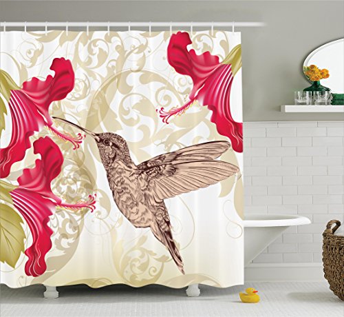 Ambesonne Hummingbirds Decorations Collection, Bird and Hibiscus Flowers on Ornamental Background Vibrant Color Pattern, Polyester Fabric Bathroom Shower Curtain, 84 Inches Extra Long, Ivory Magenta