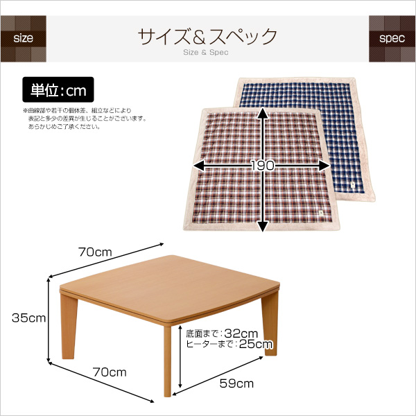 ●70cm幅・正方形のこたつテーブルとこたつ掛布団が付いた2点セット!