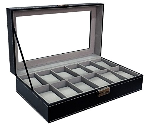 12 Mens Large Watch Box Black Pu Leather Display Glass Top Jewelry Case Organizer Box