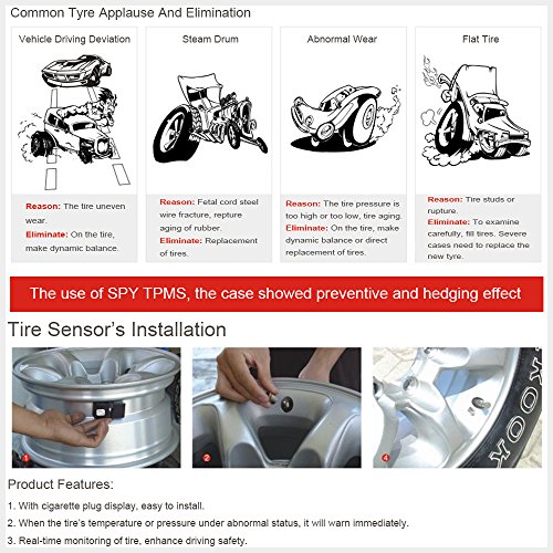 Studio : Guangdong LFF Co., Ltd. Publisher : Guangdong LFF Co., Ltd. Product Description Main Function Features Description 1. Accurately detect air pressure and temperature of each tire. 2. Tires pressure and temperature real-time monitoring by wireless transmitting. 3. Alternative measure unit. 4. The receiver displays each tire's pressure and sends audible and visual alerts for low or high tire pressures. As well as high temperature tires and air leaking: a flashing light shows the location of the problem tire. 5. Adjustable warning value (factory default setting is 200 KPa to 300 KPa is the proper air pressure and 68 Degrees is the max temperature). 6. Not necessary to interconvert the sensors when wrong display of the tyres. Only adjust the receiver. 7. Sensors low voltage warning and sensor fault warning (A character "Err" displayed means the sensor is faulty). 8. Wide display with blue background. 9. With cigar lighter plug and wireless technology make it easy installation.
