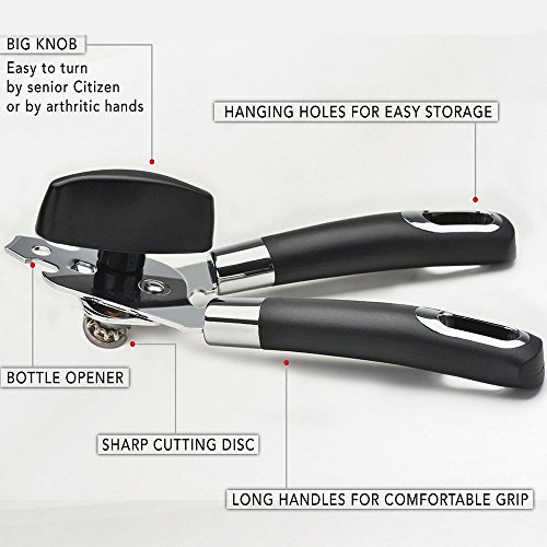 EASY TO USE - Can opener are extremely durable and heavy duty, the stainless steel blade slices through the side of the can in one touch like butter. This manual can opener is designed with very strong knife like tooth on the wheels that grips the can tightly and stays sharp for years to come. The easy to turn non-slip turning knob makes it so that anyone can use this can opener.