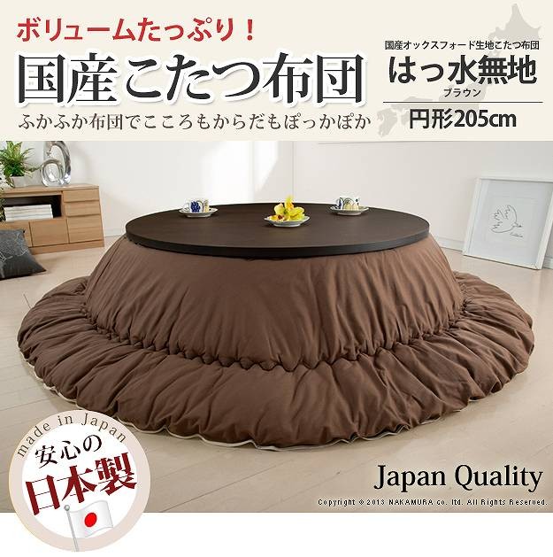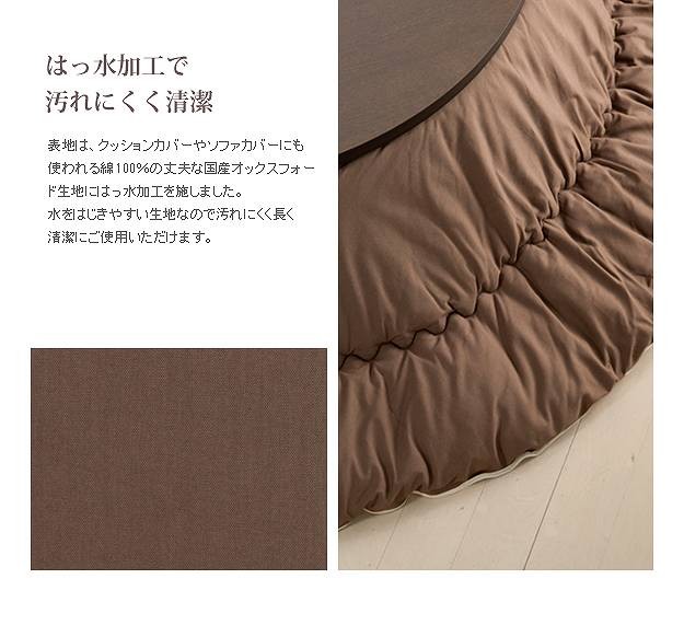 商品について:クッションやカバーにも使われる綿100%の丈夫な国産オックスフォード生地を使用した日本製のこたつ布団です。国内工場で綿入れ・縫製をしたこだわりの一品☆ボリュームたっぷり!すみまでしっかり綿が入ったふっかふかのこたつ布団です。