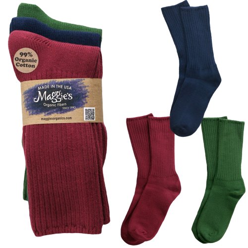 -. Binding : Apparel -. Brand : Maggie's Organics -. Department : mens -. Feature : Made with Organic Cotton fibers / Stylish / Made in USA at family owned mills in North Carolina. / Certified Organic Cotton is Fair Trade CertifiedTM and grown by a group of cooperative farmers in Nicaragua and produced according to NOP standards. -. PackageQuantity : 3 -. ProductGroup : Apparel -. ProductTypeName : SOCKSHOSIERY -. Title : Maggie's Organic Cotton Crew Sock Tri-pack