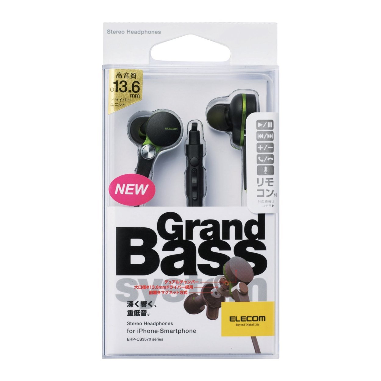 A model with a microphone for a smartphone of earplug type stereo headphone equipped with GrandBass system that realizes powerful bass and high resolution sound.