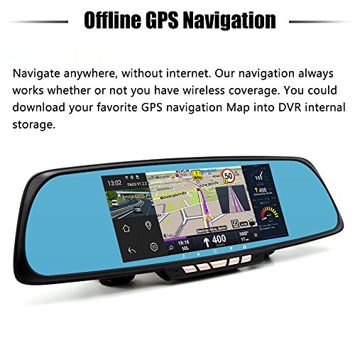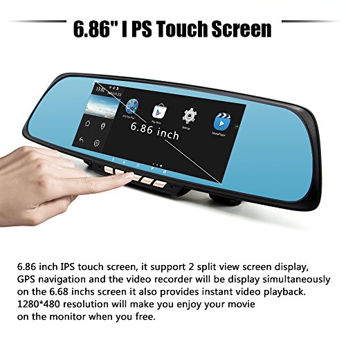 -. Feature : 6.86 inch Capacitive touch control LCD wide screen display, up to 1280*480 high resolution, with unique split screen display, show navigation and recording at the same time. / With featured function: Loop recording / G-sensor lock / FM transmitter / shortcut bar / gallery view / realtime playback /file manager / Dual camera recording simultaneously, wide angle front camera recording full HD 1920*1080P video keep an eye on your trip. two images display real time and PIP supported. The image from rear camera will be shown full screen and reversing guide line automatically while reversing. / With WiFi, grants you infinite possibility , thousands of APPs avaliable in Play store, games , videos, music get all you want in one unit ! / Professional GPS Navigation program with convenient offline maps, Guide your way wherever you want to go, also you can install your own favorite navigation APPs.