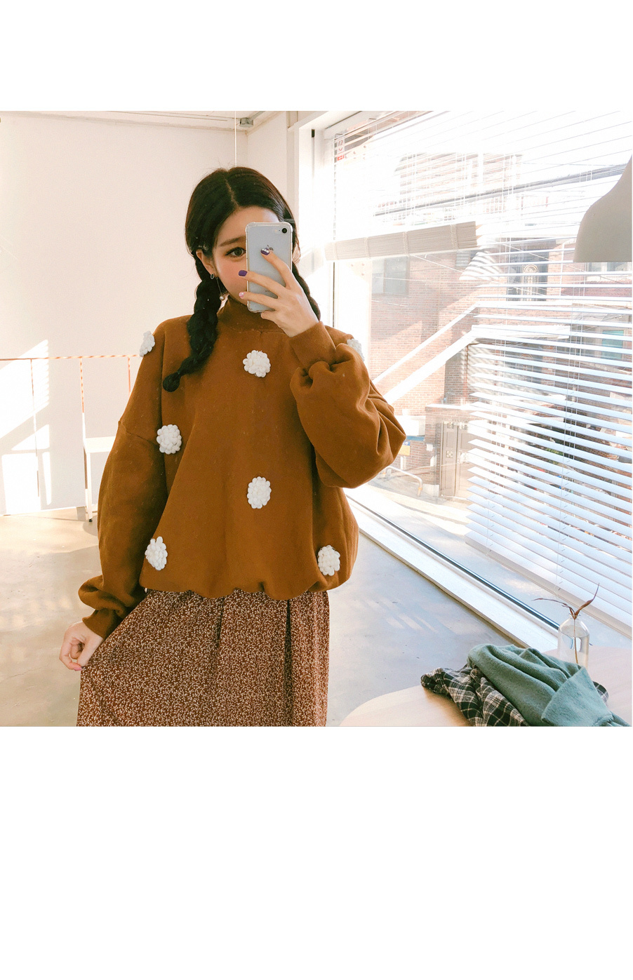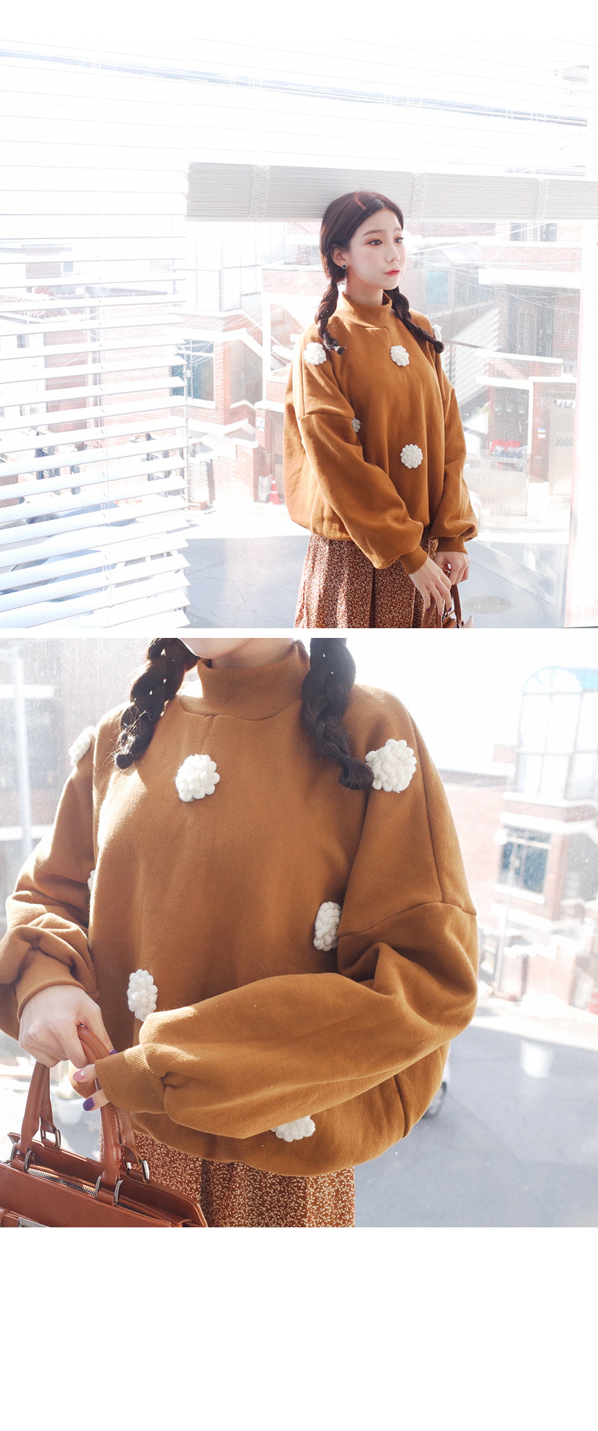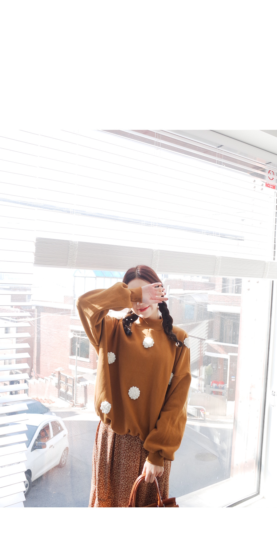 입체적인 플라워 디테일이 눈에띄는 맨투맨입니다