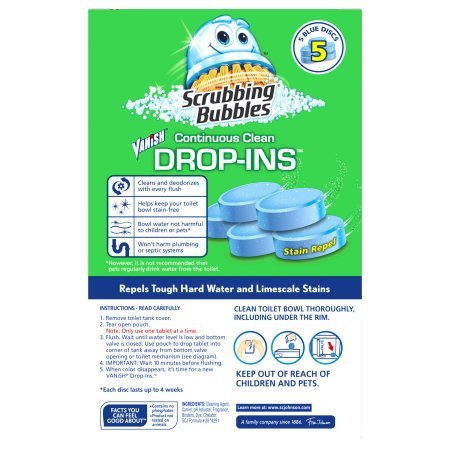 -. Binding : Kitchen -. Brand : Scrubbing Bubbles -. EAN : 7103485597102 -. Feature : We work hard, so you don't have to.Scrubbing Bubbles? Vanish? Continuous Clean Drop-Ins help keep your toilet bowl stain-free -. IsAutographed : 0 -. Model : 668187 -. MPN : 668187 -. PartNumber : 668187 -. ProductGroup : Home -. ProductTypeName : HOME -. Title : Scrubbing Bubbles Toilet Cleaner Drop Ins 5pk 1.97 x 4.00 x 6.42 Inches