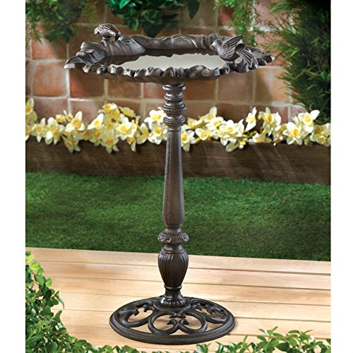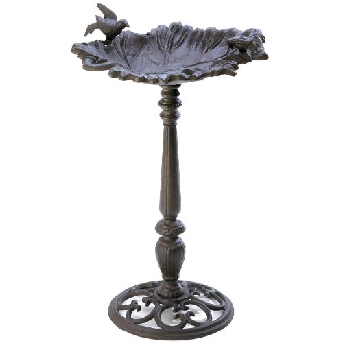 Product DescriptionFree-standing birdbath has a weathered look and a scroll style base, and two birds that will attract their feathered friends. Cast iron 16 x 15 x 23.75 inches tall0