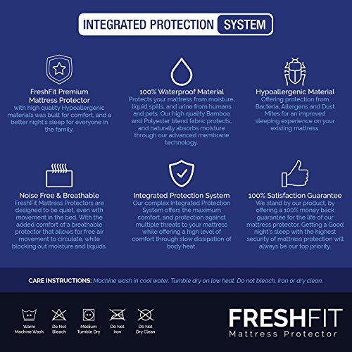 FRESHFIT premium waterproof hypoallergenic noiseless mattress protector. Comfortable vinyl free protection from dust mites, allergens, perspiration and fluid spills. KING size.
