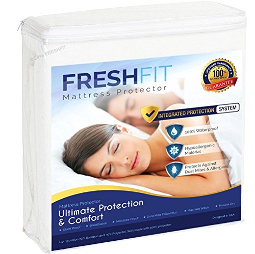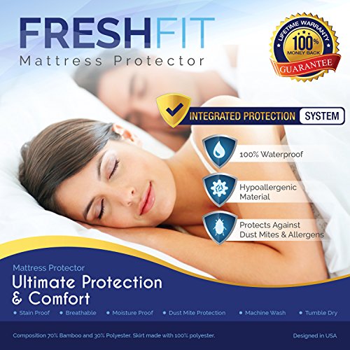 FRESHFIT premium waterproof hypoallergenic noiseless mattress protector. Comfortable vinyl free protection from dust mites, allergens, perspiration and fluid spills. QUEEN size.