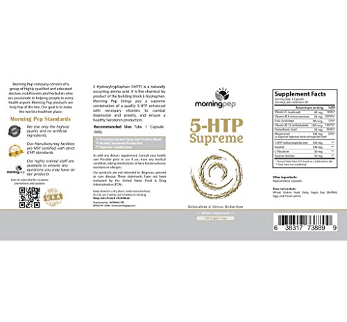 -. Binding : Health and Beauty -. Brand : Morning Pep -. EAN : 0638317738899 -. Feature : Morning Pep 5-HTP 60 Vegetarian Caps Is Backed By A 90 DAY SATISFACTION OR MONEY BACK GUARANTEE, Purchase With Confidence Knowing That We Only Source The Absolute Best Quality Ingredients Available On The Market / Morning Pep 5-HTP Is A Custom Formulation Including 5-HTP 100 mg, Inositol 100 mg, Vitamin B-6 50 mg, L-Theanine 50 mg, Taurine 50 mg, Vitamin C 60 mg, Pantothenic Acid 50 mg, Magnesium Bisglycinate Chelate - Oxide 100 mg, L-Methyl Folate 50 mcg, Vitamin B-12 100 mcg, / Morning Pep 5-HTP Vegetarian Caps Is fully reacted And Completely Pure. There Are No Fillers Such as Silicon dioxide Or Magnesium stearate or GMO Artificial Ingredients, It is Also Free of Soy Gluten Milk Egg Corn or Wheat. / Morning Pep 5-HTP Is A Natural Relaxation Sleep Aid Support Supplement, Promoting Healthy Sleep Mood Relaxation And Aids Insomnia Stress & Panic Attacks / Morning Pep 5-HTP Are Manufactured And Packaged In The USA In a FDA And GMP Approved Facility for purity and potency -. IsAdultProduct : 0 -. Label : Morning Pep -. Manufacturer : Morning Pep -. MPN : 3889 -. PackageQuantity : 1 -. PartNumber : 3889 -. ProductGroup : Health and Beauty -. ProductTypeName : HEALTH_PERSONAL_CARE -. Publisher : Morning Pep -. Size : 60 -. Studio : Morning Pep -. Title : 5-HTP 60 Vegetarian Caps, Is A Custom Formulated Natural Relaxation Sleep Aid Support Supplement, Promoting Healthy Sleep Mood Relaxation And Aids Insomnia Anxiety Stress & Panic Attacks -. UPC : 638317738899