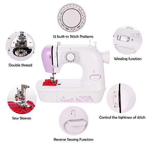 -. Feature : Perfect sewing machine for beginners and sewing lovers, it works for everyday sewing projects, such as altering and creating clothing, crafting, quilting, pillow cover,bed sheet,home decor and kids dolls etc. / Double Thread - 12 Built-In Stitch Patterns; Automatic Thread Rewind; Sews Sleeves; Drawer Included; Built-In Sewing LED Light; Includes Thread Cutter / Dimension - 11.4 x 4.5 x 9.6inch (L x W x H),Lightweight, portable and save space / Low Noise, Stable Operation, Include Multifunction Sewing Tool; Adjustable Stitch tightness; Reserve Sewing Function / Package Content - 1 x Sewing Machine, 1 x Foot Pedal, 2 x Sewing Thread, 2 x Bobbin, 1 x Needle Threader, 1 x Needle, 1 x Thread Guide, 1 x AC Adapter, 1 x Manual
