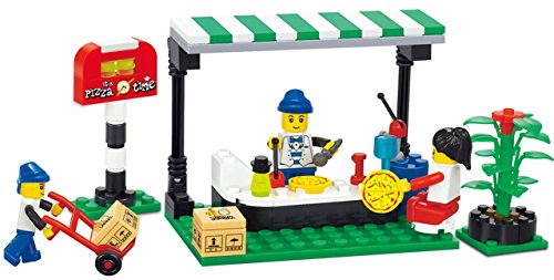 -. Title : Pizzeria Commercial Street - 107 pcs out door Pizza restaurant building blocks set with plant pot, signage, kitchen, counters, tables and staff - a must for a future 6+ chef in L.E.G.O compatible parts