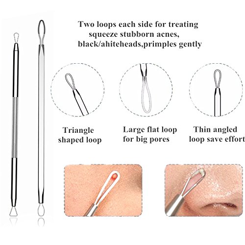 - MULTI-FUNCTIONAL - 6 piece of professional pimple extractor in different sizes and angles ,which can help to remove blackheads, acne and various blemishes, keep your face clean and smooth without redness or scar.