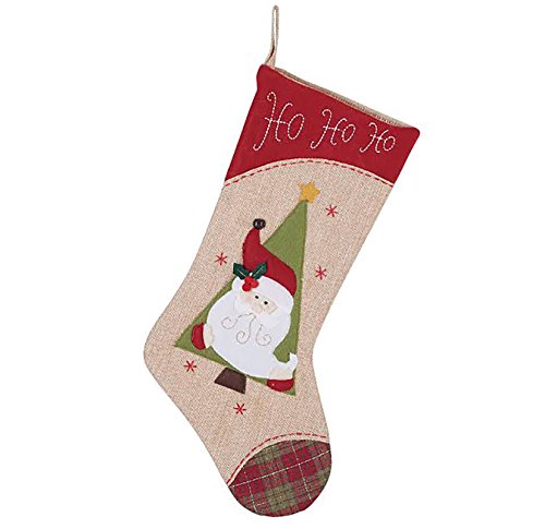 Ho Ho Ho Santa Christmas Tree 20 inch Burlap Stocking with Plaid Toe Decoration