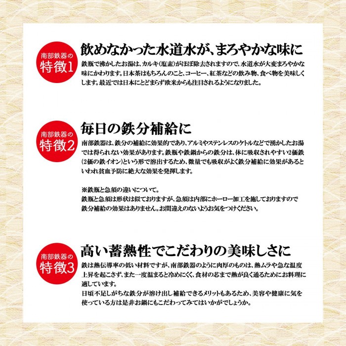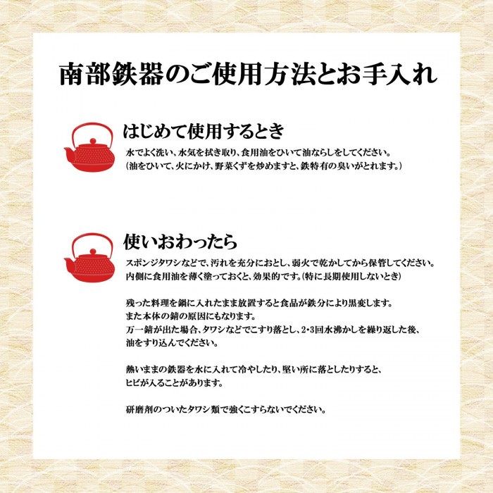 鍋の厚さが薄いと、油の温度変化などで均等に具材に火が通りにくくなります。南部鉄器の鋳鉄製の鍋は厚みがあるので、温度変化が少なく美味しく揚げられます。 |
