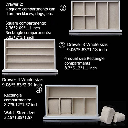 3 removable drawers for maximum jewelry storage. The first and second drawers have equal size: Each size: 9.06"L x 5.83"W x 1.18"H. (see the pictures for details). The first drawer has 6 compartments; the second drawer has 4 compartments.