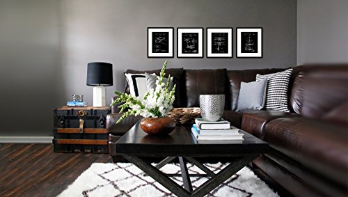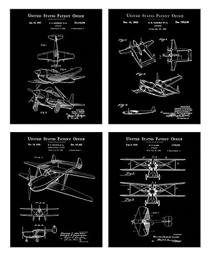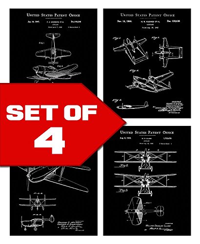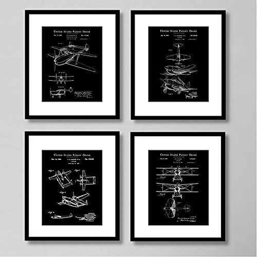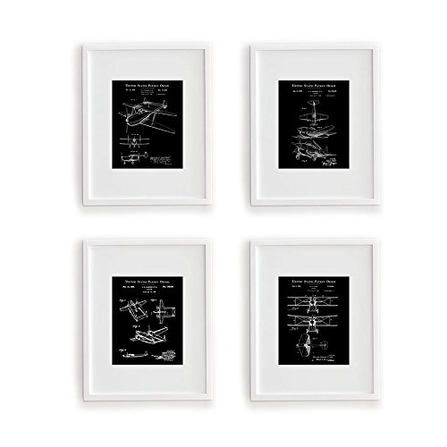 This handsome four piece print set bundle will make the perfect gift for those "hard to buy for" men in your life! The set includes four 8x10 vintage airplane patent drawings in a sleek white on black photo-negative design. Designed Exclusively for Wallables. Perfect for any office, den, bathroom, bedroom, study, or living room. Printed on thick, acid free, archival quality, EXTRA HEAVY stock. These prints come unframed so you can choose the right frame and matting for your decor. They look great in a natural wood frame, plain black, white or metal gallery frames. These prints will add a touch of vintage elegance to any contemporary decor! Vintage aviation and airplanes are a classic and popular theme that everyone loves and you are guaranteed to get compliments on these gorgeous and tasteful prints. Makes a perfect gift for the men in your life! (Father, Boyfriend, Son, Grand kids, etc). Quick shipping! All Wallables designs make great gifts and can be found here on Amazon at http://amazon.com/shops/wallablesFeature