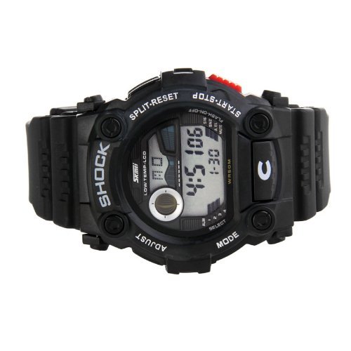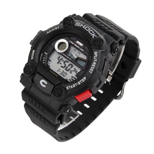 Movement types: electronic table; Strap: Rubber; Dial Shape: Round; Display Type: Digital; Watch Category: Mens Watch; Color Category: Black; Condition: New; Waterproof: 30 m; Special Features: 24 hours to indicate the alarm calendar luminous lighting; Clasp: pin buckle