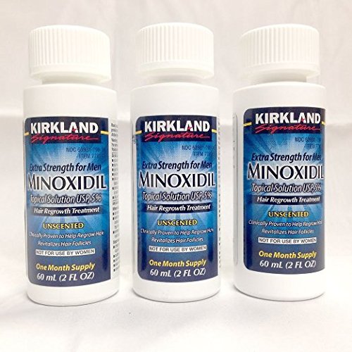 -. Binding : Misc. -. Brand : Minoxidil -. EAN : 0885797617842 -. Feature : INTENDED FOR MEN ONLY / To be applied on the vertex of the head / Promote hair growth with the rich formula of the Kirkland Signature Minoxidil 5% treatment made for men. The active ingredient of this Kirkland extra strength treatment is 5% Minoxidil that nourishes the hair follicle to facilitate the hair growth process.As believed by the makers, this Kirkland hair loss treatment takes about 2 - 4 months time for effective results to start showing. Just 1 ml of the Kirkland Signature Minoxidil 5% treatment has to be applied twice daily to give you the best results possible. There is a child-resistant dropper applicators in this Kirkland extra strength treatment, for easy application. Treat thinning hair and balding with this Kirkland hair loss treatment. -. IsAdultProduct : 0 -. Label : Kirkland -. Manufacturer : Kirkland -. Model : Minoxidil 3 Months -. MPN : Minoxidil 3 Months -. NumberOfItems : 9999 -. PackageQuantity : 3 -. PartNumber : Minoxidil 3 Months -. ProductGroup : Beauty -. ProductTypeName : BEAUTY -. Publisher : Kirkland -. Size : 2 Ounces -. Studio : Kirkland -. Title : Kirkland Minoxidil-5% Extra Strength Generic Hair Regrowth for Men, 3 Count, 2 Ounce Bottles 3 Months Supply -. UPC : 885797617842