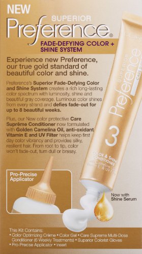With fade-defying colorants, superior preference stays true to tone for up to eight weeks without fading or turning dull and brassy. Care supreme conditioner, enriched with vitamin e and UV filter, helps lock in first-day color vibrancy, brilliance, and get a salon like look in minutes.Feature