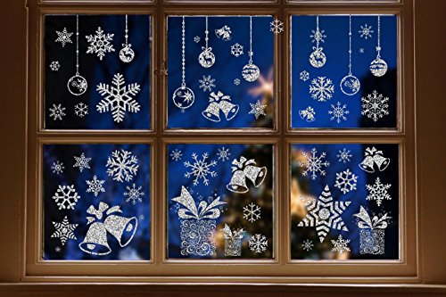 Joiedomi 80 Pcs Glitter Snowflakes Window Wall Peel & Stick Decals Holiday Winter Christmas Home Decorations Snow White Stickers (Also including Jingle Bell, Gift Box , Ornaments Designs)