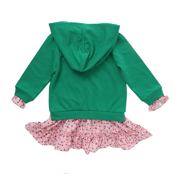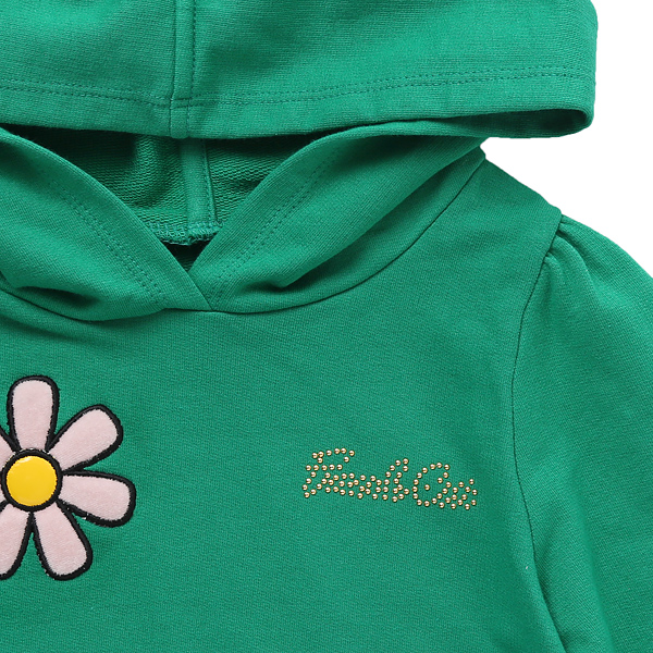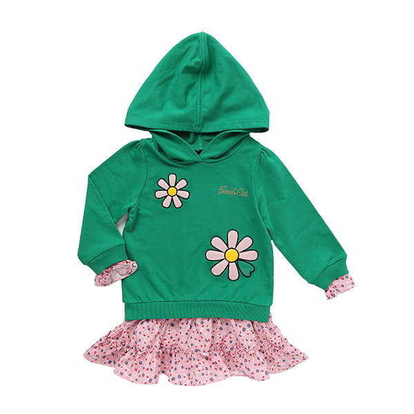 상품설명 산듯한 그린 컬러의 후드 원피스 입니다. 스커트는 핑크 계열의 플라워 패턴 원단으로 배색되어 페미닌한 무드를 더해주었습니다. 몸판에는 핑크 플라워 아플리케 자수가 들어가 러블리한 원피스입니다. 화이트 타이즈나 레깅스와 같이 입으시기 좋습니다.